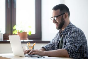 Happy male writing positive mail to client
